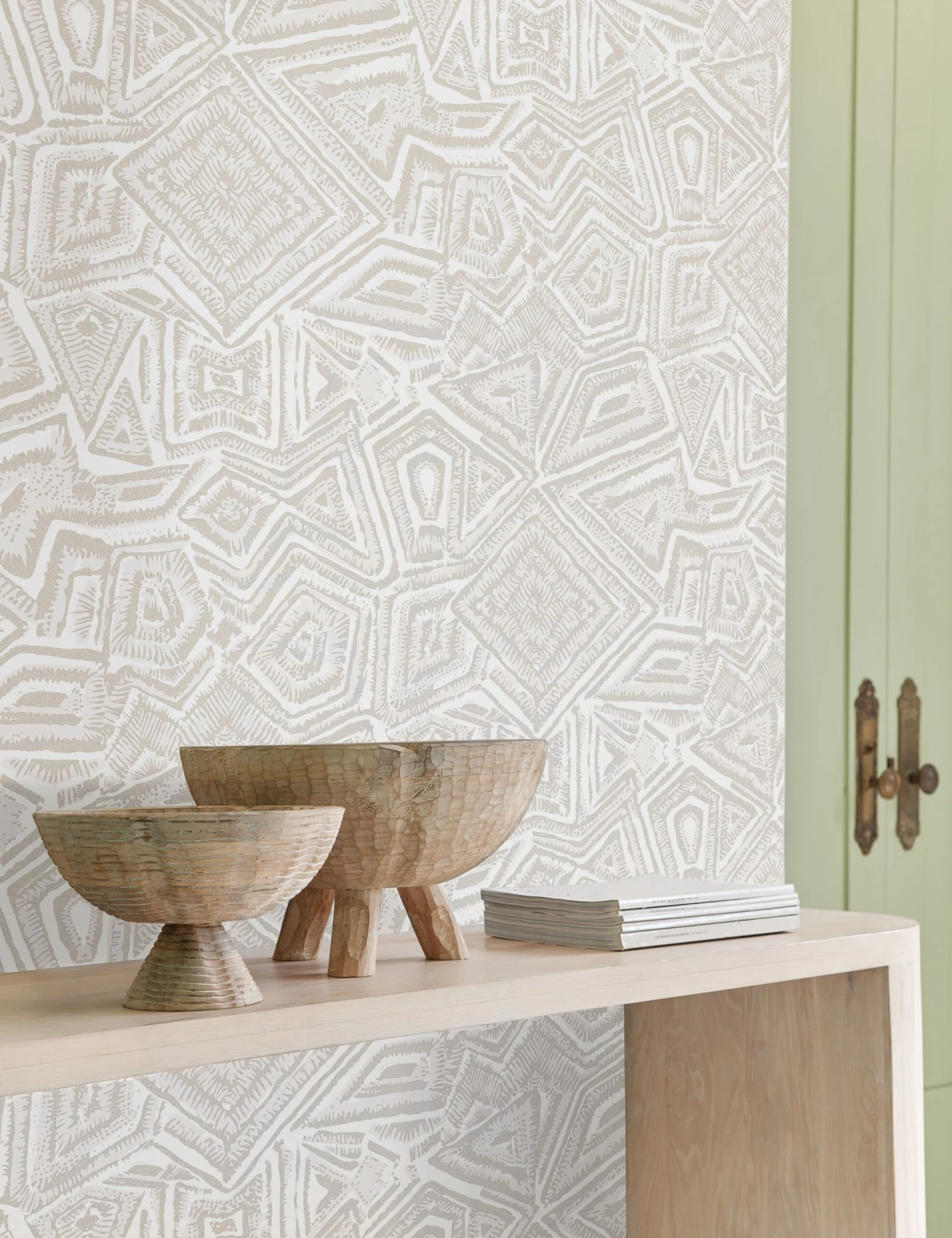 Multidisciplinary artist and activist Malene Barnett’s work envisions a contemporary Black experience rooted in the cultural and artistic traditions of the African diaspora. Her Kindred Collection, exclusive to Lulu and Georgia, reinterprets her hand-built ceramic vessels as tactile paper wall styles. The Malou Wallpaper celebrates the legacy of Afro-Caribbean women potters with its intricate and raised pattern. A chalky white finish offers a tonal look, perfect for styling it in a bathroom or transitional space.
