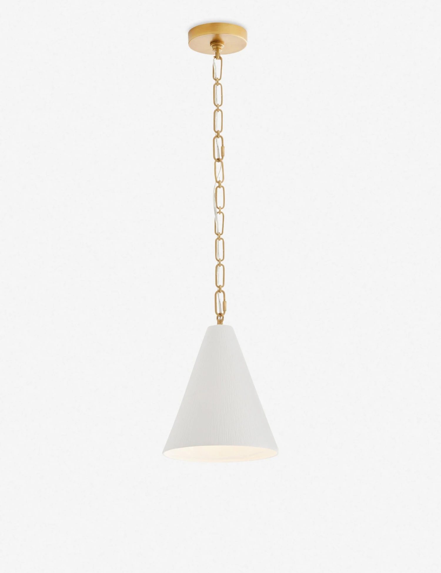 Sleek, timeless, and set for transitional appeal, the Oakland pendant pairs a conical porcelain shade with an antique brass finished chain. Chiseled detailing brings textural intrigue to the clean lines and translucent quality of this hanging light fixture creating a stunning overhead feature.