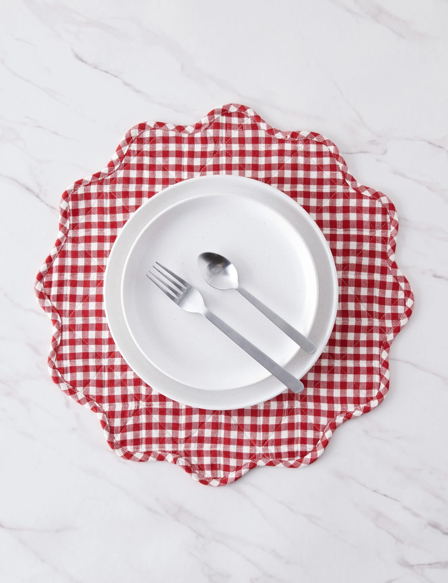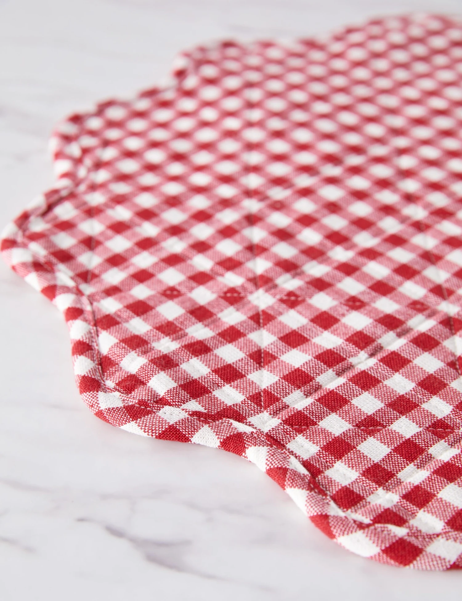 Heather Taylor Home designs linens that fold into and elevate every gathered occasion. Featuring a stylish mini gingham design, this handwoven cotton placemat makes for an eye-catching dinnertable accent with its quilted construction and a scalloped edge.
