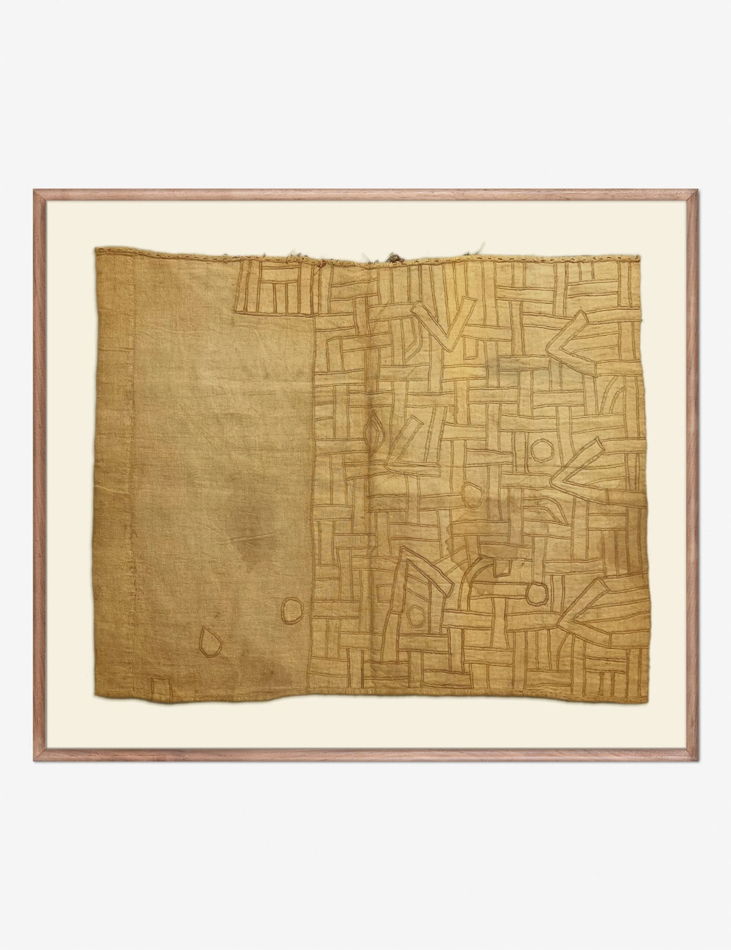 Bring a singular touch to your wall decor with this one-of-a-kind cloth from Congo. The word Kuba means lighting and refers to the blades once used by Kuba warriors. Each cloth is handcrafted using traditional techniques—first woven on a small loom, then embroidered with their tactile design—before being floated in a walnut frame for a truly unique piece of textile wall art.
